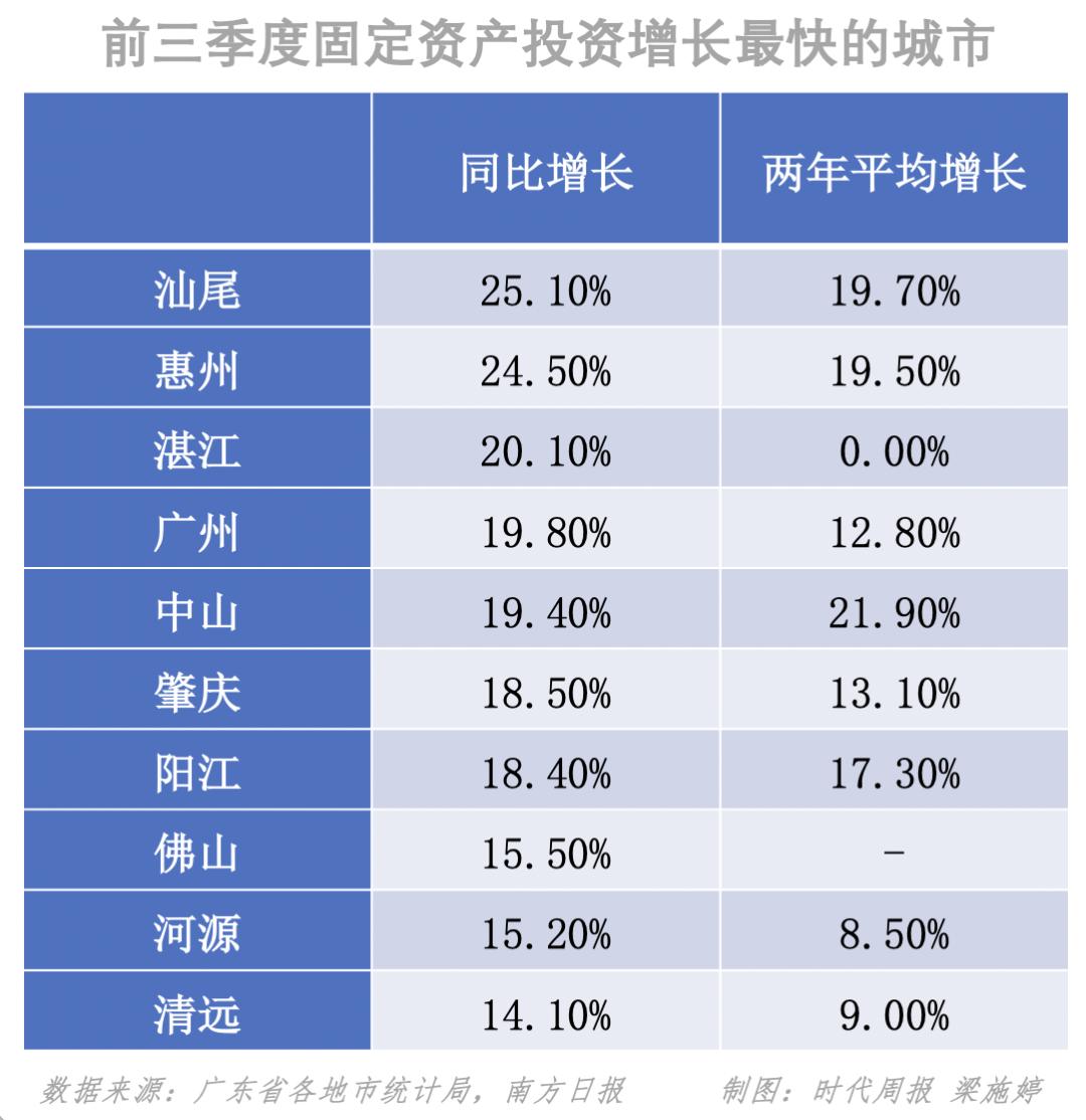 截至11月1日,广东省21个地级市已经陆续公布了前三季度经济运行情况。其中,包括广州、佛山、汕头在内的14个地级市前三季度GDP增速超过全国9.8%的水平,包括汕尾、肇庆、惠州在内的12个地级市增速达到两位数。