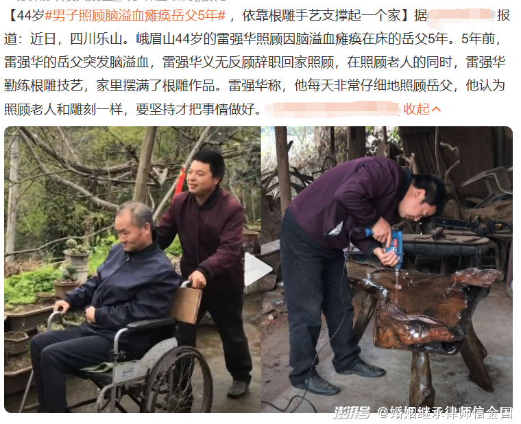近日看到的这个新闻,心里很触动。岳父瘫痪在床5年,小舅子结婚了在省外生活,妻子在外带着孩子读书,于是男子义无反顾辞职回来照顾岳父,早上洗脸,半夜接尿,比照顾小孩还要细心。