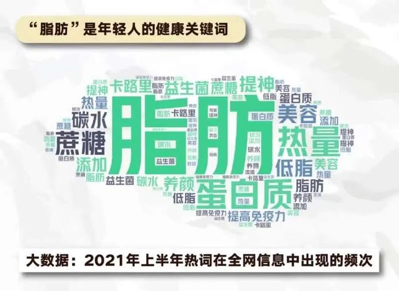 报告调研部分表明,碳酸饮料、蛋白饮料(如乳制品等)、包装饮用水是受访年轻人平日最常饮用的三大饮品品类。尽管饮品难以割舍,但控蔗糖控脂肪观念深入人心。选择无蔗糖与三分糖饮品的受访年轻人超半数,且年纪越大,越能自觉告别“无糖不欢”的生活。与此同时,报告大数据部分显示,在2021年上半年与饮品健康相关的报道和网民讨论中,“脂肪”被提到的频次高居榜首,“蛋白质”“热量”“蔗糖”等词则紧随其后。