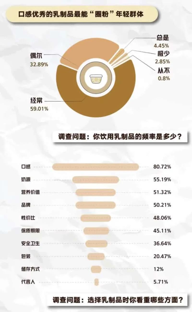 数据还显示,近六成受访者经常饮用乳制品,除口感优秀外,奶源、营养价值、品牌与性价比都是年轻群体挑选乳制品时看重的关键要素。这似乎也解释了,蒙牛、伊利等传统乳品品牌在产品上的创新趋势,以及诸如北海牧场等新锐乳品品牌在市场上的异军突起。