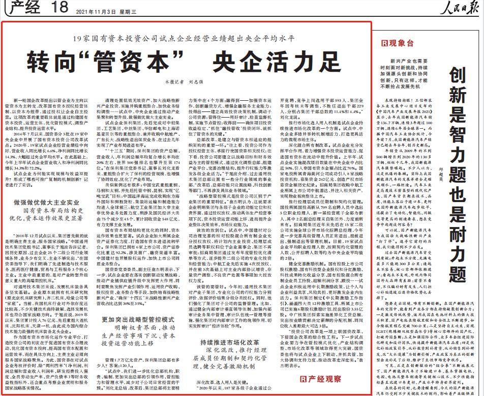 11月3日,《人民日报》刊发《19家国有资本投资公司试点企业经营业绩超出央企平均水平:转向“管资本” 央企活力足》。报道指出:
