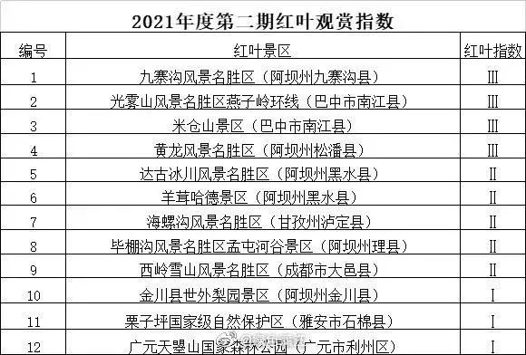 图:四川发布从指数可以看到,未来一周又新增了观赏红叶的地方,米仓山、羊茸哈德、海螺沟、西岭雪山等已进入Ⅱ级-Ⅲ级,预计等到这周末将会进入最佳观赏时期。