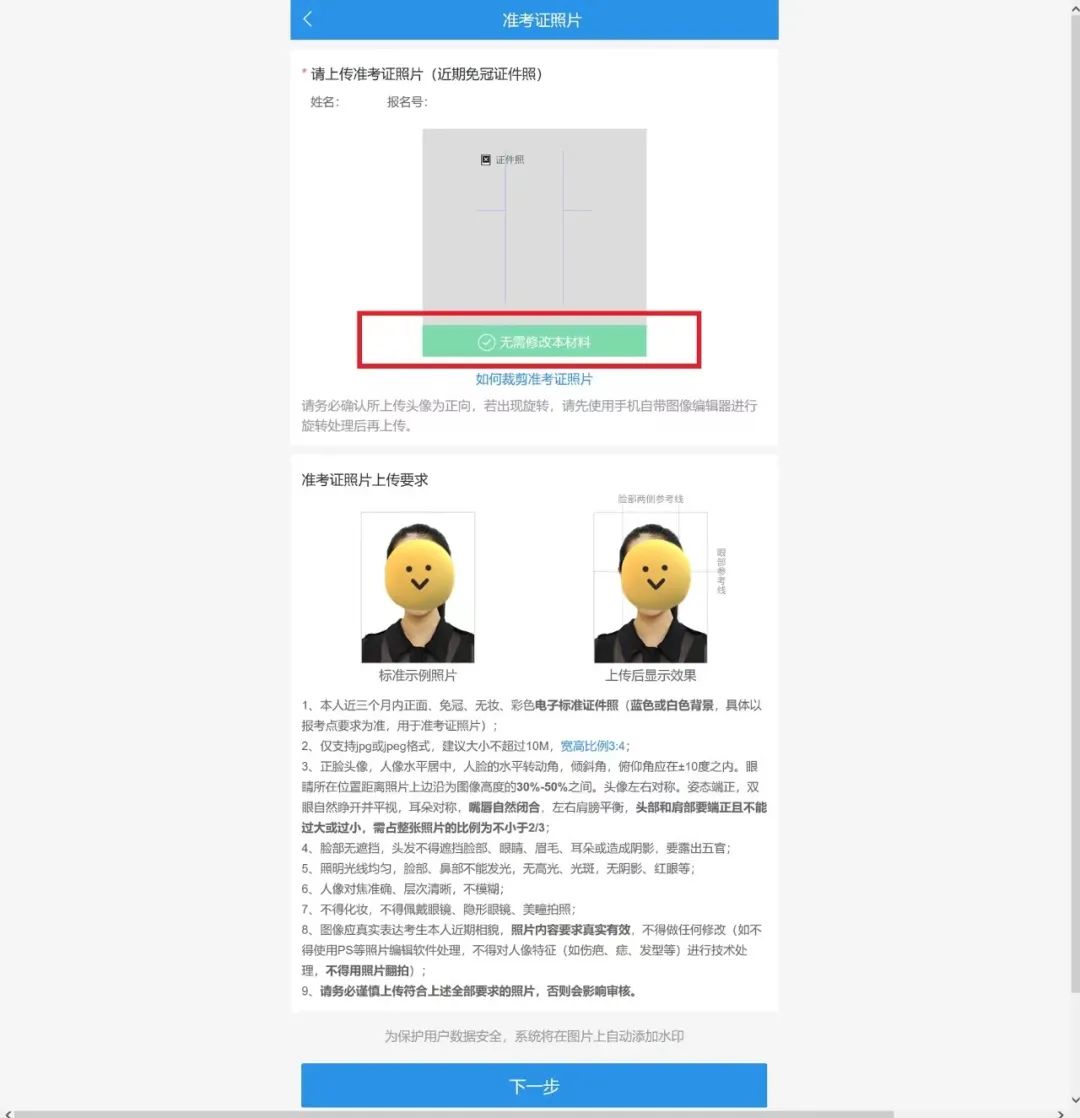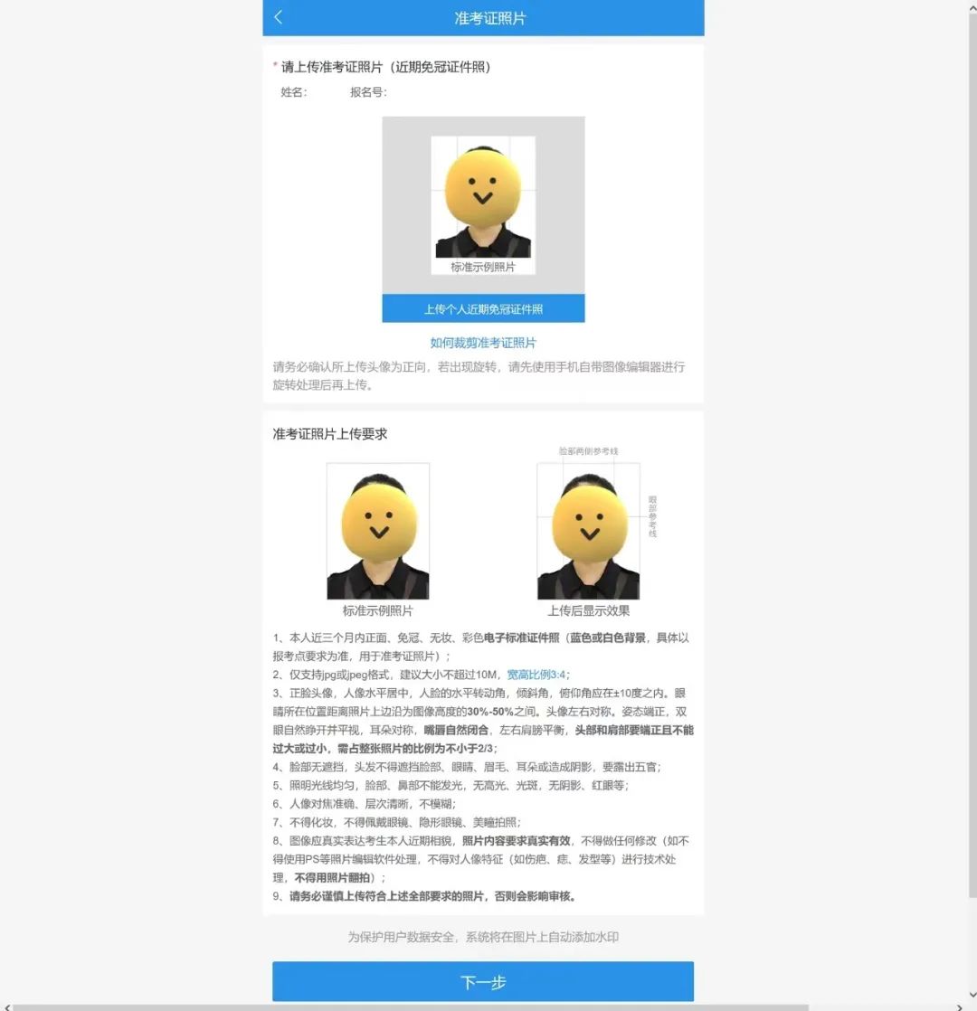 材料要求:考生本人最近三个月内正面、免冠、彩色一寸电子证件照(白色背景,用于准考证照片等),宽高比例3:4,坐姿端正。照片格式与文件大小详见系统要求,对考生提供的无法清晰、准确辨识的照片,将置为“审核不通过”,考生须重新提交照片,重新进行审核。