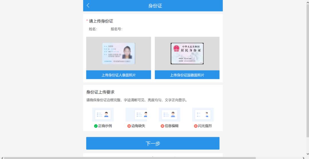 2.身份证(必传)材料要求:考生网报时持有的本人有效居民身份证原件正反面图片。分正、反面两张上传,请确保身份证边框完整,字迹清晰,亮度均匀。