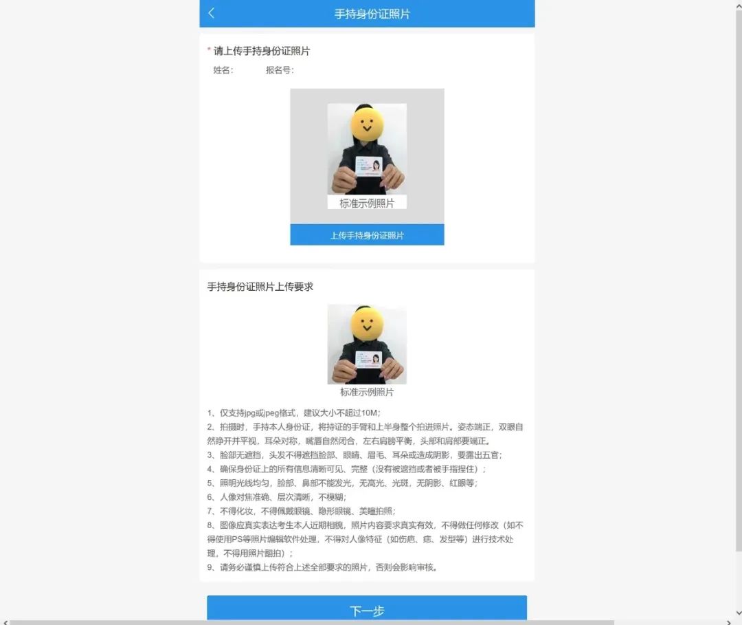 3.手持身份证照片(必传)材料要求:拍摄时,须将持证的手臂和上半身整体拍入照片,确保头部和肩部端正,五官露出,头发不得遮挡脸部或造成阴影,确保身份证上的所有信息可见、完整,照片背景整洁干净。对考生提供的无法清晰、准确辨识的照片,将置为“审核不通过”,考生须重新提交照片,重新进行审核。