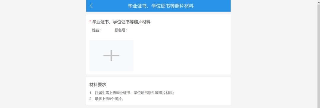 4.毕业证书、学位证书等照片材料材料要求:往届生必传,应届生无需上传。提交考生毕业证书(网报中填报的最后学历的毕业证书)照片(必须提供)和学位证书照片(网报中填报学位信息的须提供)。