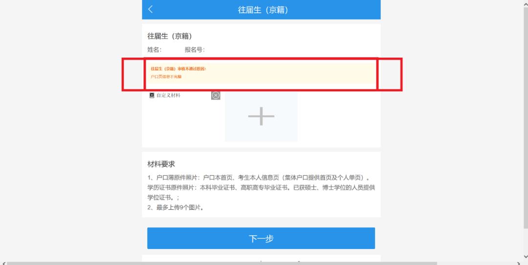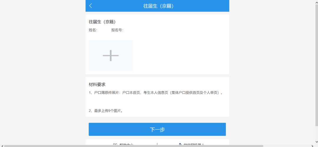 5.户口材料材料要求:京籍往届考生必传;非京籍往届考生无需上传,直接点击“下一步”。须上传户口本首页(公安部门盖章户主页)及考生本人信息页照片(集体户口提供首页及个人单页,首页须有户口单位盖章),也可提供由公安部门出具的户籍证明原件照片。