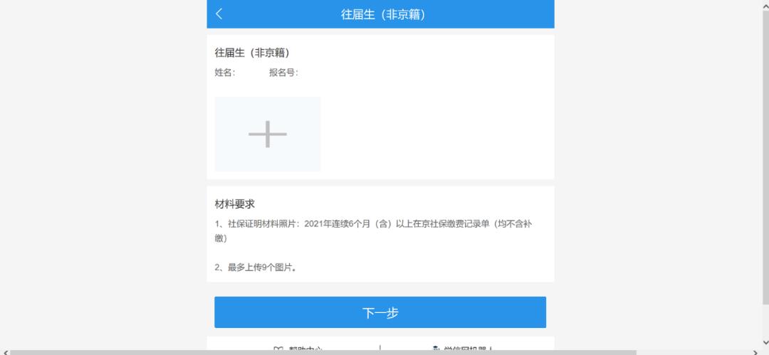 6.社保材料材料要求:非京籍往届考生必传;京籍往届考生无需上传,直接点击“下一步”。须提交本人报名当年在京连续缴纳6个月(含)以上社会保险中的基本养老保险或基本医疗保险(均不含补缴)的北京市社会保险个人权益记录电子版证明材料(需加盖北京市社会保险基金管理中心公章、北京市医疗保险事务管理中心公章)。