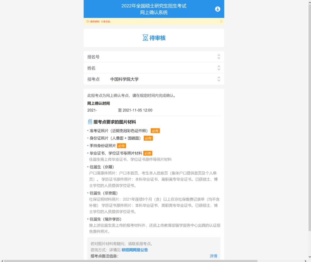 截至2021年11月5日下午16:00考点网上确认结束,未在规定时间内上传材料或未在规定时间内补充材料的考生,报名信息无效,后果由考生本人承担。
