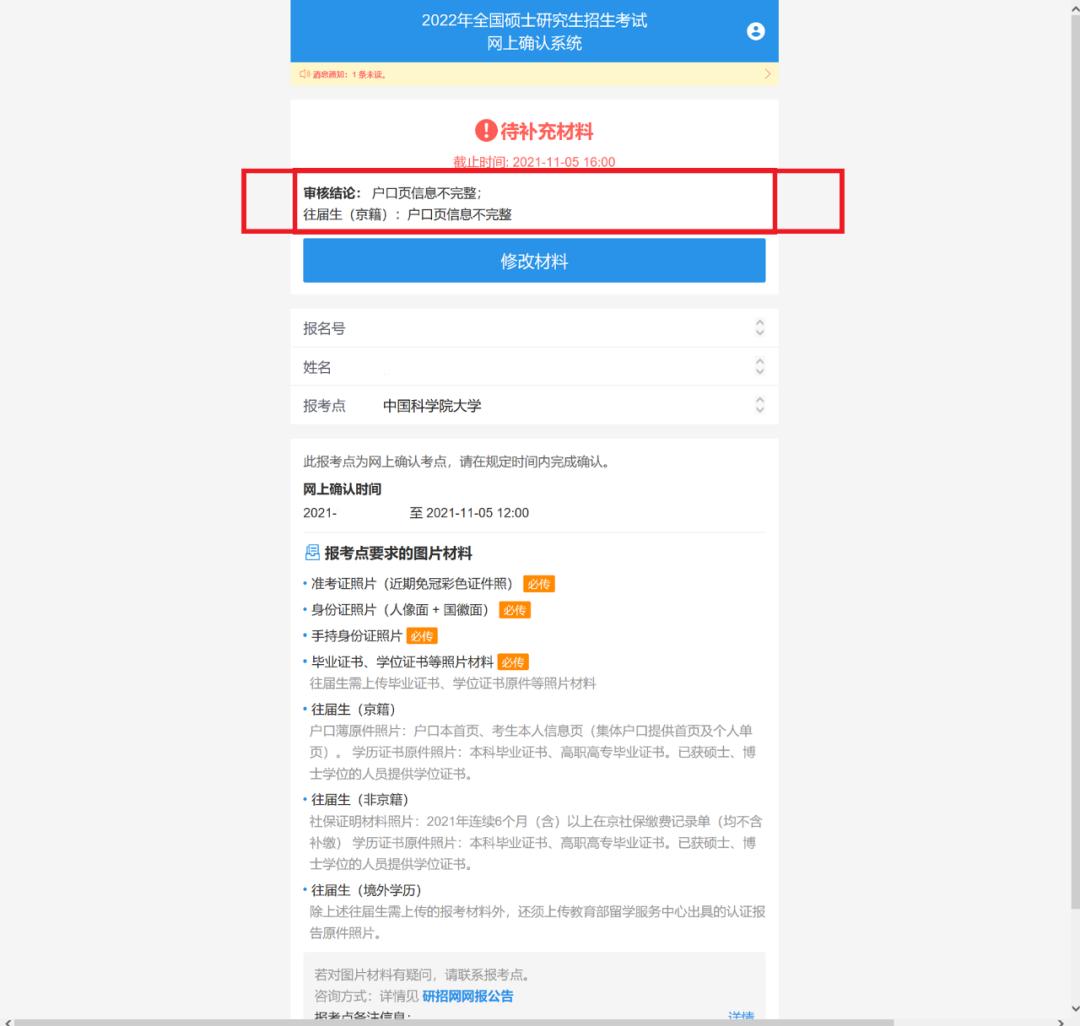 2.需要修改的材料,系统显示审核不通过原因,考生须补充上传材料。