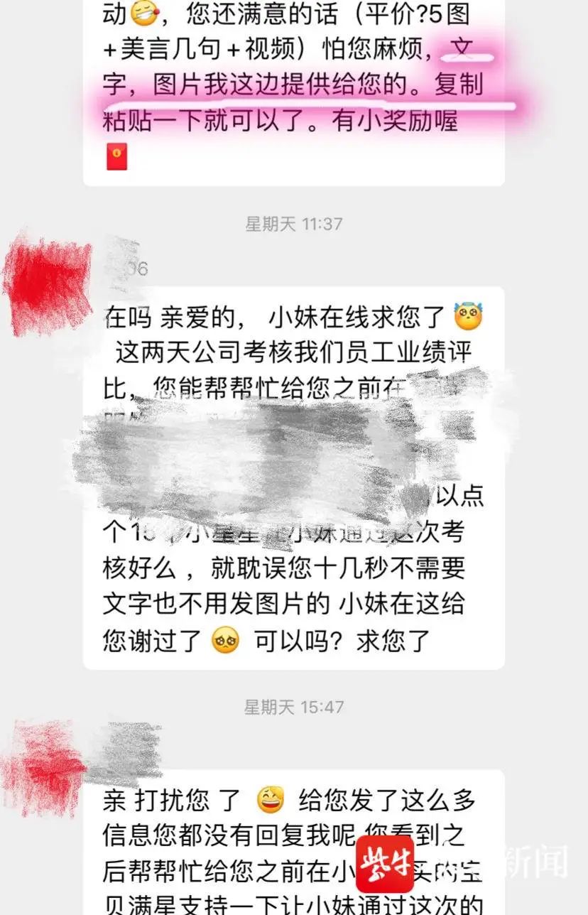 客服表示文字、图片都是现成的而令李洁头疼的是还在后面,由于她迟迟未给出评价,也未回复客服信息,所以商家客服不停通过线上平台发送信息,更通过短信方式多次发信息给她。“麻烦您看下淘宝”“求您看下淘宝”,她向记者展示客服发送的短信。“他们通过我的网购信息获得联系方式发短信给我,我作为消费者的隐私就这样流出,这点令我不安。”
