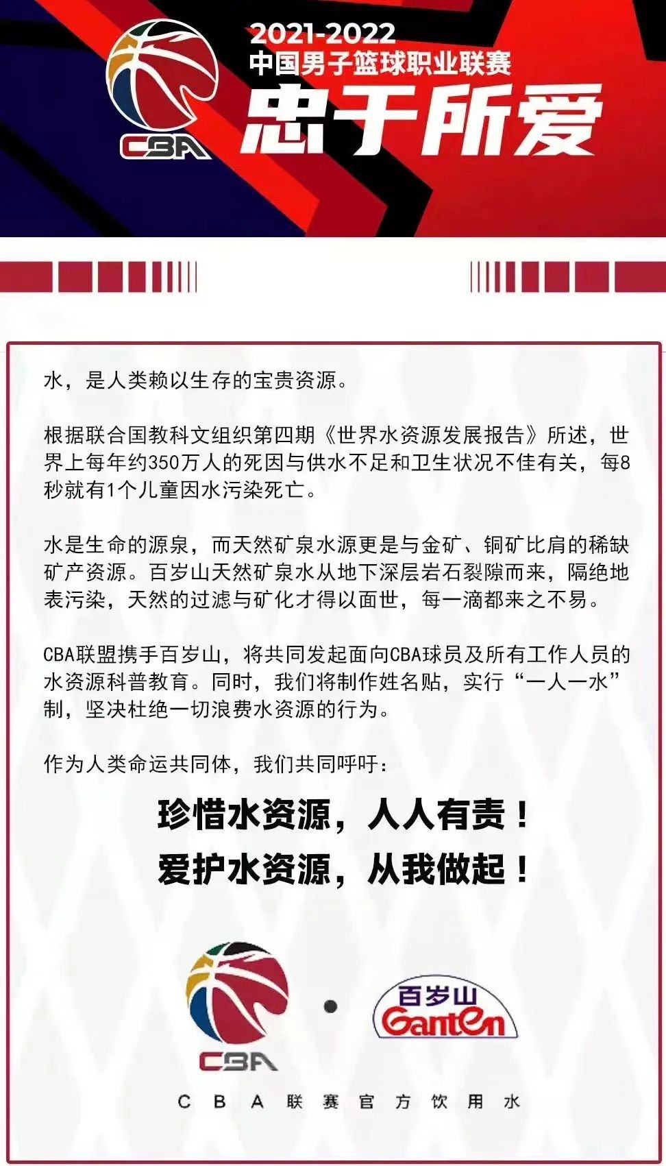 CBA呼吁节水CBA江苏同曦球员西热力江近日在社交媒体发布的一段视频,披露了CBA球队健身房饮用水存在大量浪费的现象,呼吁球员们要节约用水。3日,CBA官方发文表示支持,呼吁CBA所有参与者“珍惜水资源,爱护水资源!”据悉,CBA联盟将发起面向CBA球员及所有工作人员的水资源科普教育,并酝酿在比赛和训练期间发放姓名贴,实行“一人一水”制,坚决杜绝一切浪费水资源的行为。