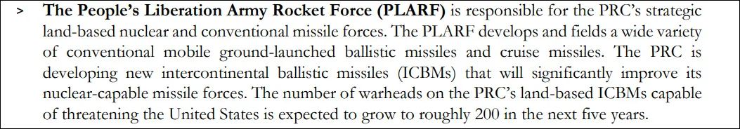 去年美国报告中提及的解放军导弹数量《报告》还提及,解放军的核战略也随着核力量机构的变化。《报告》称,新建的洲际导弹发射井证实,解放军已经将核反击策略修改为“基于预警发射”(LOW)。