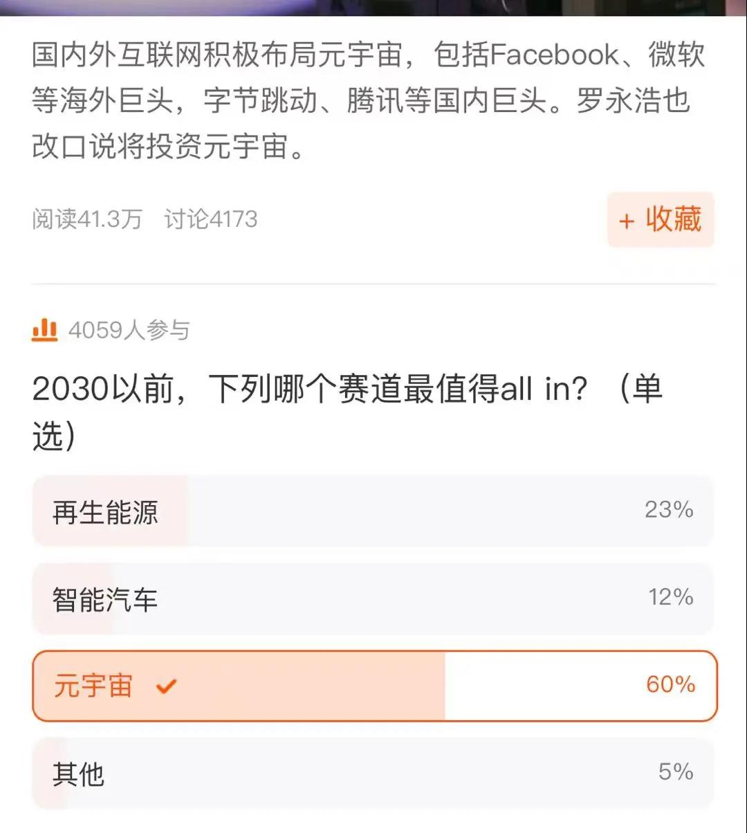 在该话题下共计4059人参与了题为“2030以前,下列哪个赛道最值得all in?”的投票活动。其中,选择“元宇宙”的比例达60%,遥遥领先。