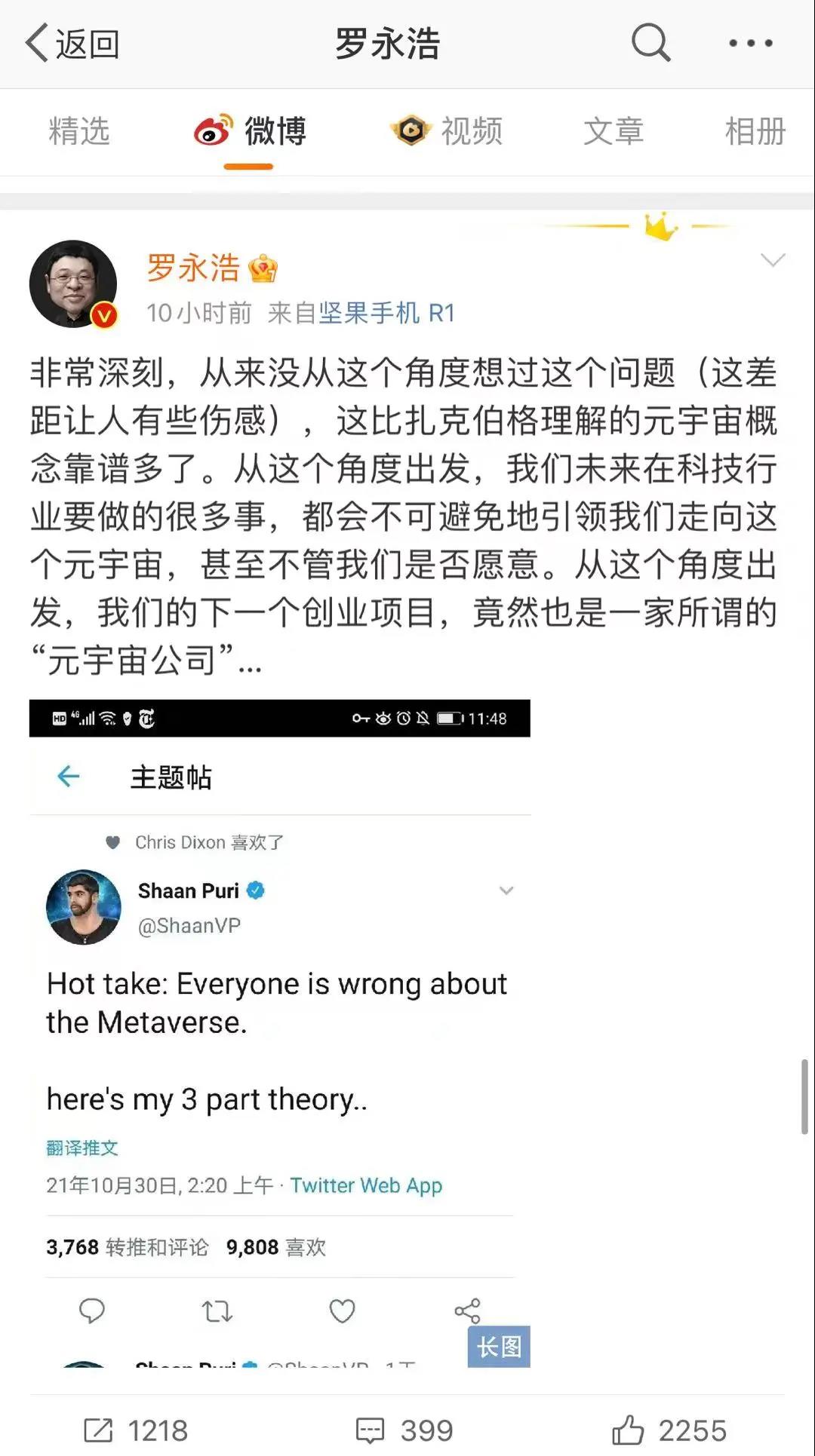 对此,罗永浩在其微博回应称:“转了Shaan Puri的元宇宙观(原帖英文),他的想法跟现在对元宇宙的普遍庸俗理解和炒作完全不同,并且有非常深刻的洞察。我早晨想表达的意思是从他的这个定义出发,大多数的IT公司,其实都是在领着我们走向元宇宙,我们即将启动的新创业公司也是一样。”