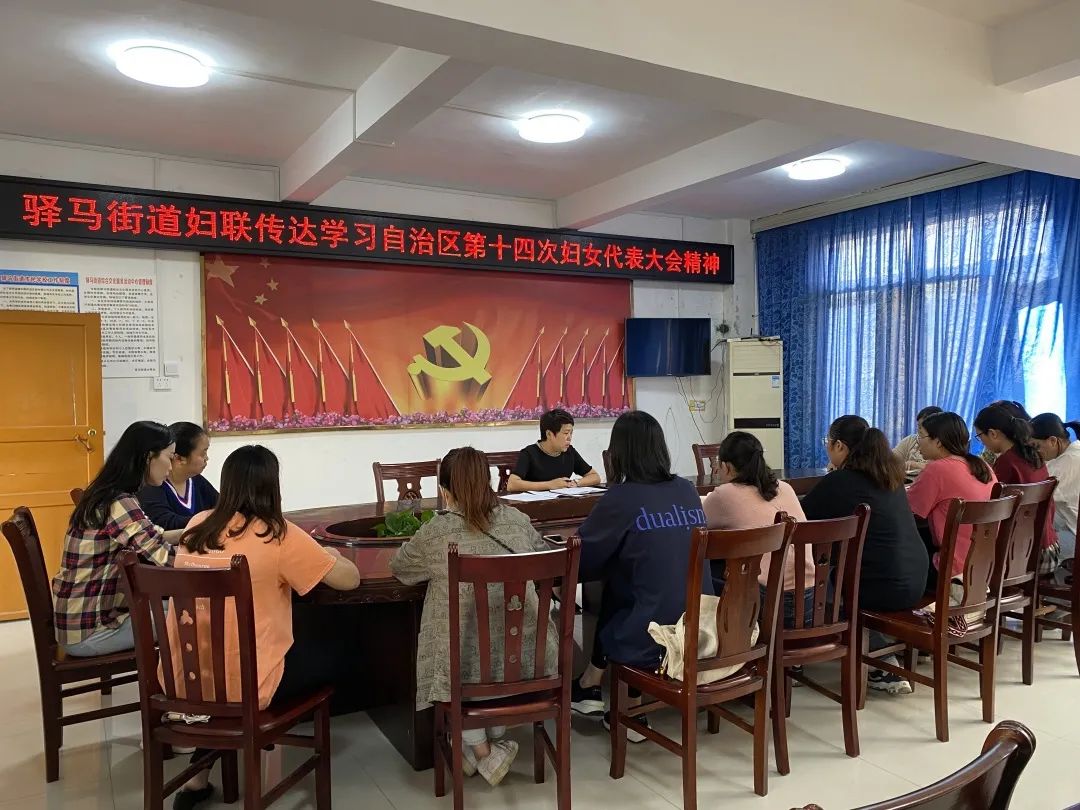 海城区驿马街道妇联召开会议,街道妇联主席朱懋萍带领大家学习广西妇女十四大精神。