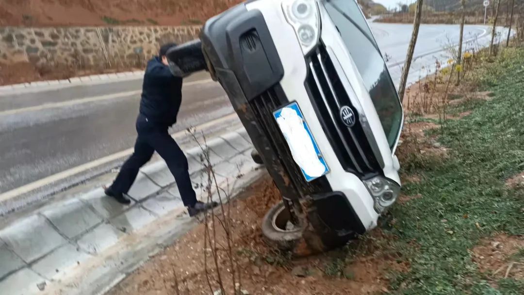 近日,隆德县公安局刑侦大队的民警马卓和李文博两位同志办完案驱车返回单位的途中,遇到一辆白色SUV侧翻到路边的排水渠中,情况十分危急,见状,两位同志紧急停车,迅速前往救援。
