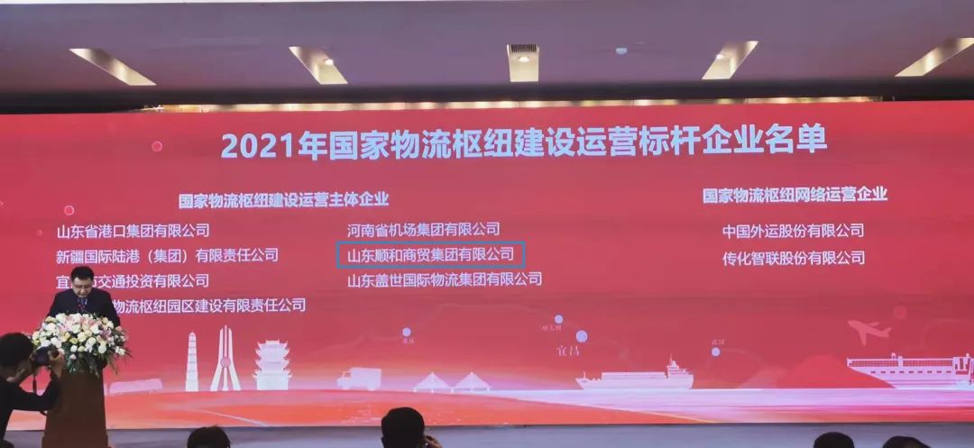 在2021年国家物流枢纽建设联合推进会暨第19次全国物流园区年会现场,山东顺和商贸集团有限公司作为临沂商贸服务型国家物流枢纽建设运营主体企业,山东顺和商贸集团有限公司被评为国家物流枢纽建设运营标杆企业。