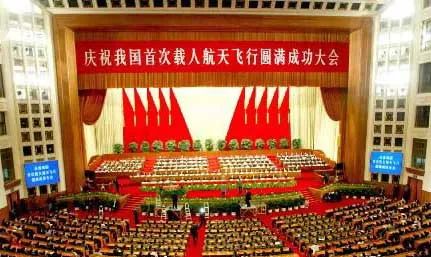 庆祝我国首次载人航天飞行圆满成功大会在北京召开。图片来源:新华社2003年11月7日上午,中共中央、国务院、中央军委在人民大会堂举行庆祝我国首次载人航天飞行圆满成功大会。
