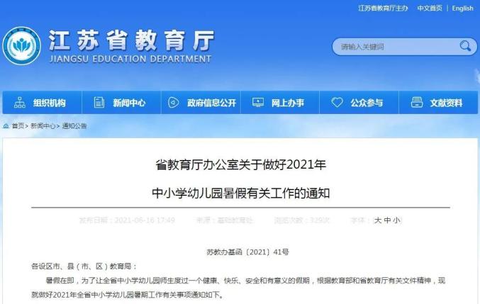 今年6月16日,江苏省教育厅办公室就做好2021年中小学幼儿园暑假有关工作下发了通知。其中已经明确——
