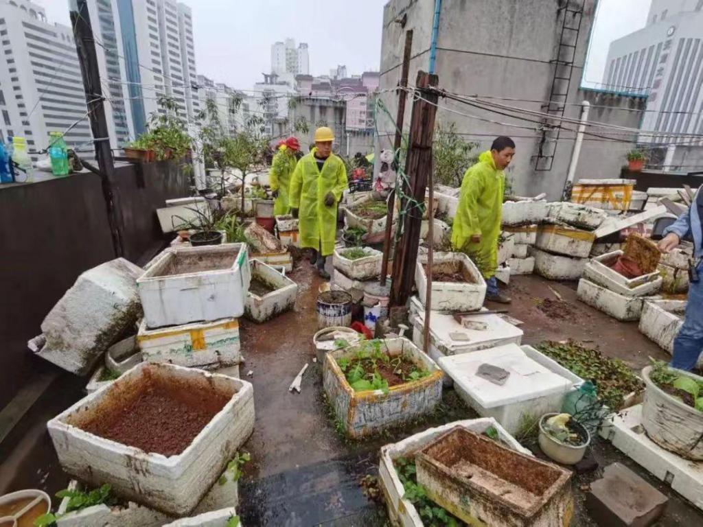 11 月 4 日,侯家塘街道梓园社区,在和家生活(湖南)科技服务有限公司工作人员的协助下,大型吊车在 27 米高空挥动 " 手臂 ",长岭大院新四栋楼顶违规堆放的花盆菜土被悉数清除。这也标志着梓园社区在街道辖区率先 " 吃螃蟹 ",在老旧开放式无物业小区试水 " 连片打包 " 物业管理服务,迈出破解老旧小区管理难步伐。
