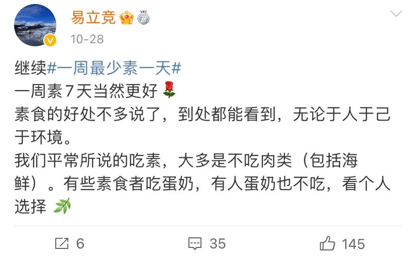 尽管素食的人比以前多,但大家对素食依然存在各种不解。近日,易立竞在直播中透露自己吃素14年。为了推广素食,她每周发一条带有#一周最少素一天#标签的微博。