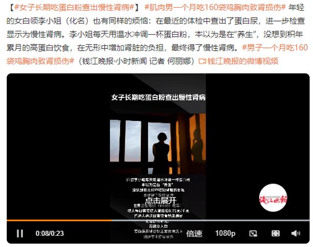 关于蛋白粉多吃伤肾的新闻截图。/微博每当被问及健身秘诀,他会给出朴素的答案:“真正的肌肉是长年累月刻苦训练出来的。你看看做粗重活儿的农民工,他们一身肌肉,吃的肉不是很多,但每顿吃两斤饭太平常了。只要吃得均衡够热量,配合锻炼就能长肌肉。”
