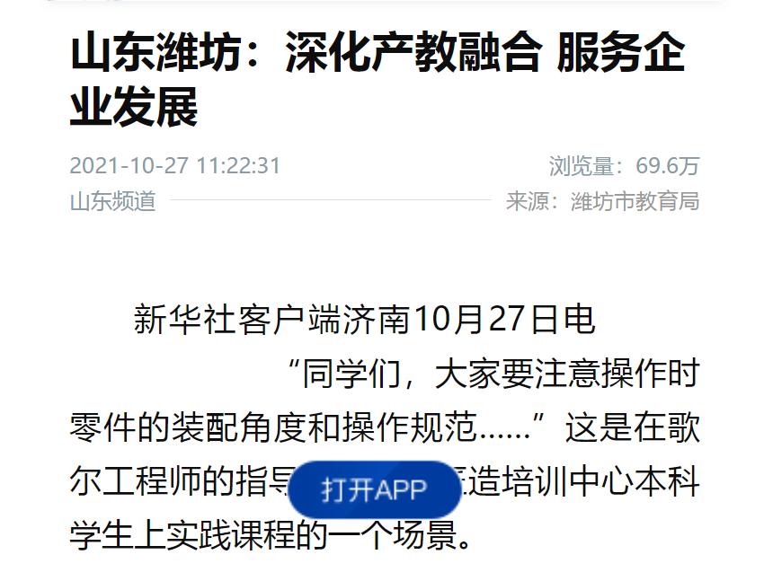 新华社报道《山东潍坊:深化产教融合 服务企业发展》,为推进现代产业学院建设,加快构建校企命运共同体,推动校企合作高质量发展,市教育局结合产业布局和重点企业特点,“一产业一方案、一企业一策略”分类指导,精准施策。协助潍柴动力、歌尔股份、北汽福田、润丰化工等大型企业,主动对接高校,特别是已有合作关系的高校,拓展合作领域,共建现代产业学院。瞄准潍坊“十强”产业,聚焦智能制造、海洋化工、电子信息、现代农业、新材料新能源等产业,潍坊市筛选临朐铝业、寿光蔬菜集团、盛瑞传动、天瑞重工等中型目标企业,采取企业联盟、产业联盟等形式,抱团凝聚发展合力,积极参与产业学院建设。