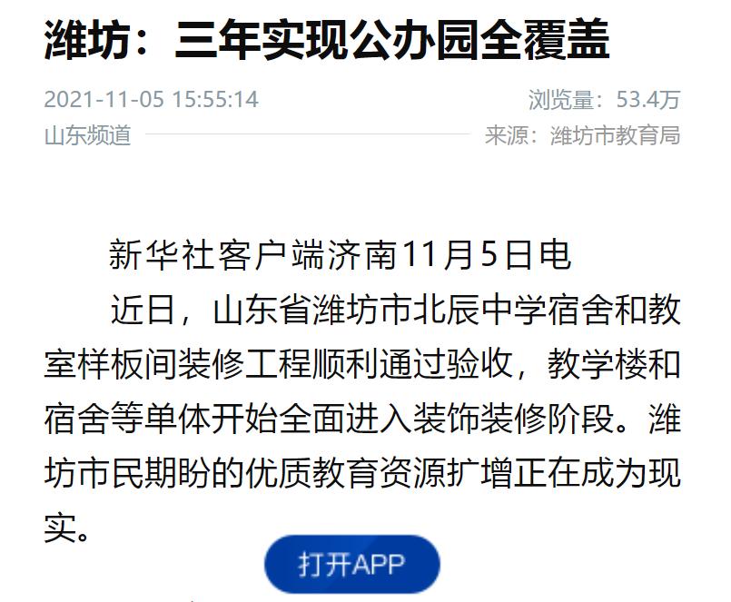 新华社报道《潍坊:三年实现公办园全覆盖》,今年秋季学期(2021年9月至12月),潍坊市计划开工幼儿园135所,已经开工133所,计划竣工幼儿园24所,已经竣工24所;计划提升乡村幼儿园59所,已完成55所;计划开工义务教育学校75所,已经开工61所,计划竣工义务教育学校33所,已经竣工学校22所,新增学位3.43万个;计划开工普通高中学校4所,已经开工2所;计划对61所农村中小学校办学条件进行提升,已经完成改造47所。