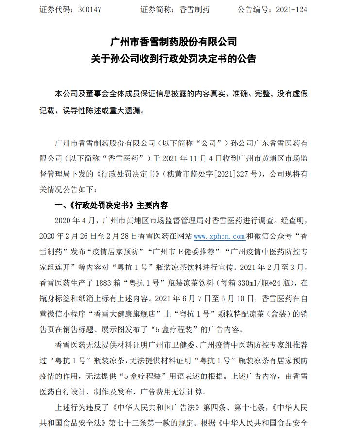 日前,广州市香雪制药有限公司发布公告称,其孙公司广东香雪医药有限公司(以下简称“香雪医药”)收到广州市黄埔区市场监督管理局下发的行政处罚。