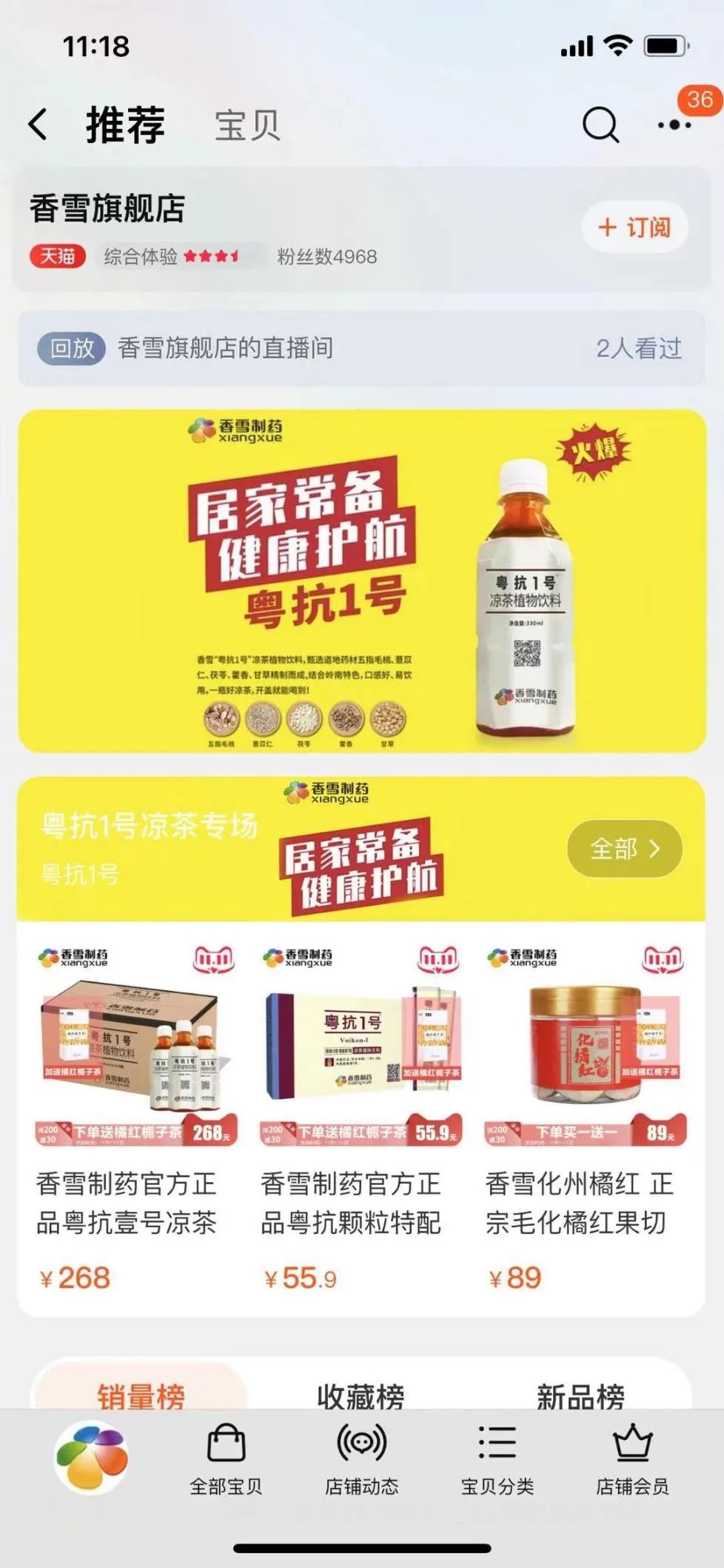 11月8日,记者在淘宝网搜索“粤抗1号”,发现该相关产品仍在出售。其中,天猫香雪旗舰店显示,“粤抗壹号凉茶植物饮料”一箱售价在268元,不过,产品宣传语中已经没有“预防新冠”等字眼。