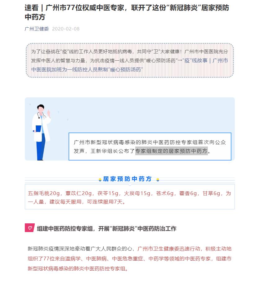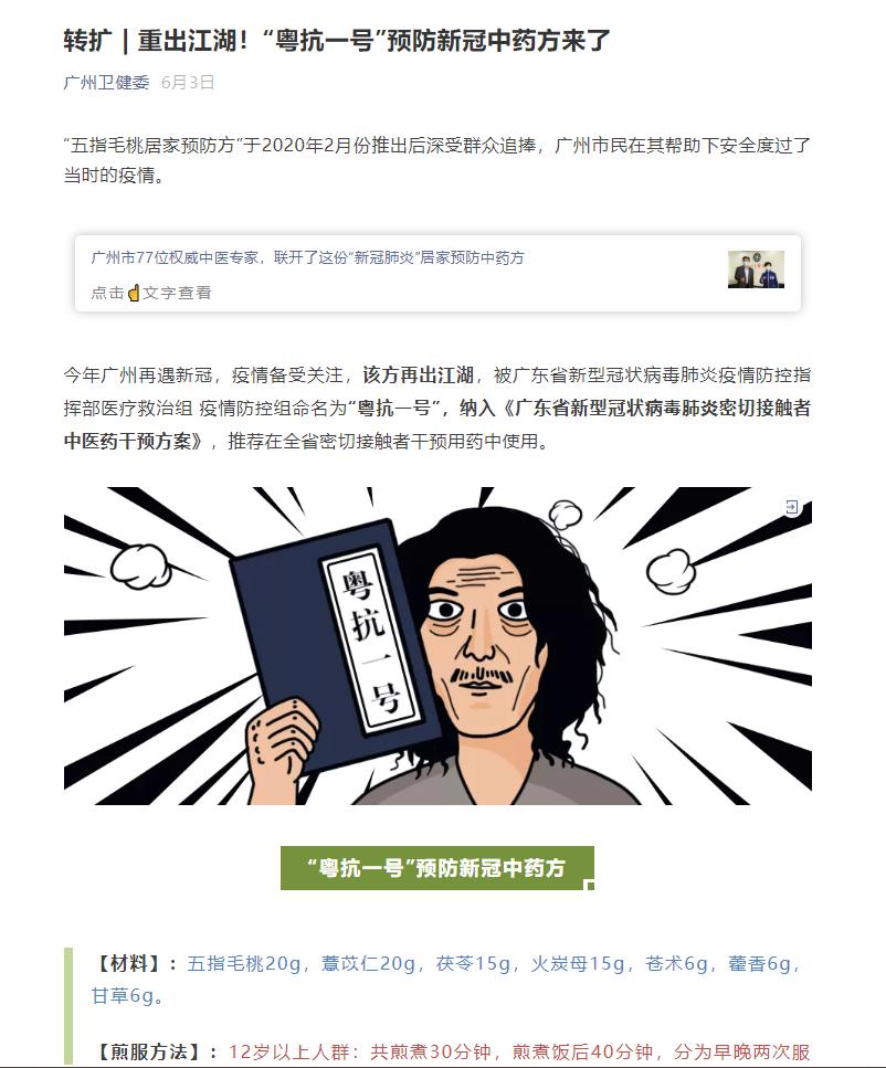 今年6月份,广州再遇新冠疫情,该中药方被广东省新型冠状病毒肺炎疫情防控指挥部医疗救治组 疫情防控组命名为“粤抗一号”,并纳入《广东省新型冠状病毒肺炎密切接触者中医药干预方案》,专家组将此定为居家预防中药方。