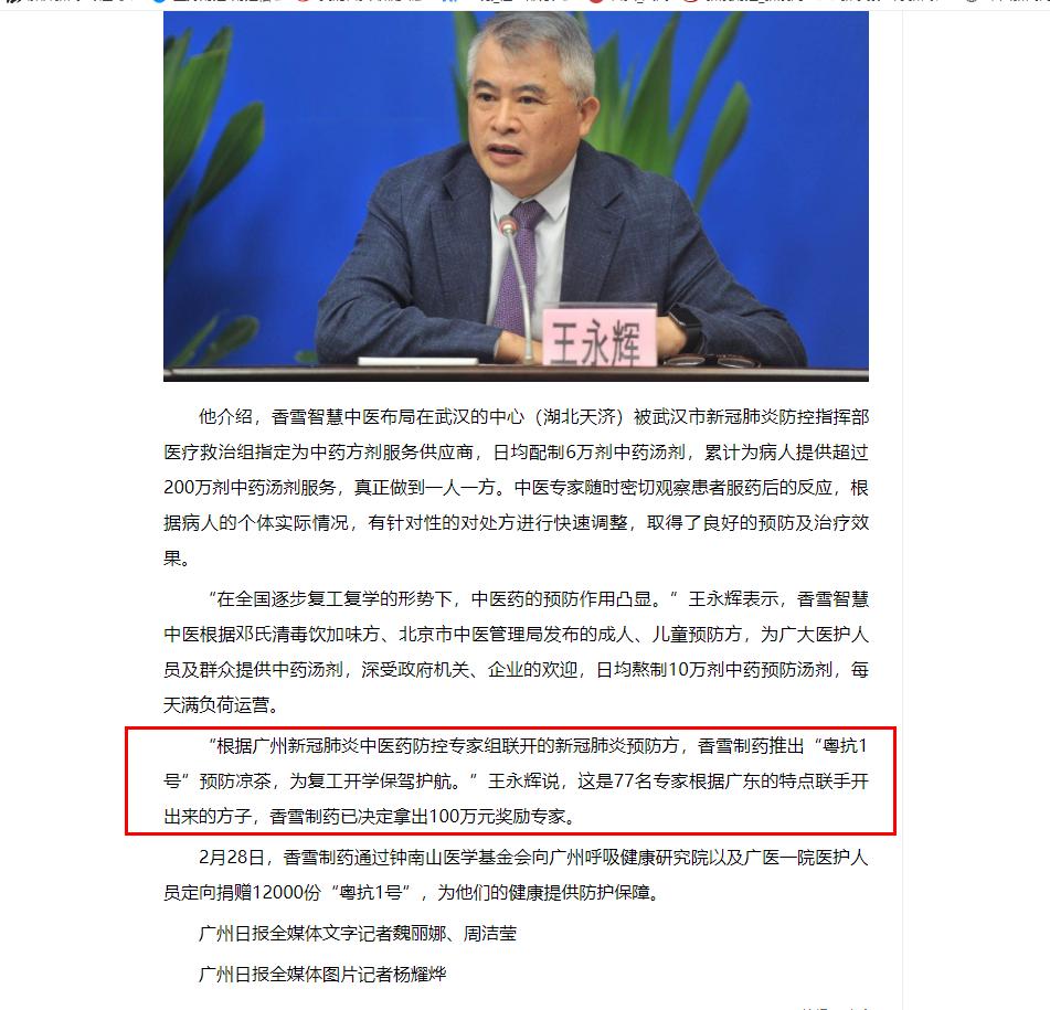 然而,令人感到蹊跷的是,广州日报曾报道,2020年2月29日广州市人民政府新闻办公室举行第27场疫情防控保障主题中西医结合专题通气会,香雪制药董事长王永辉出席了该发布会。