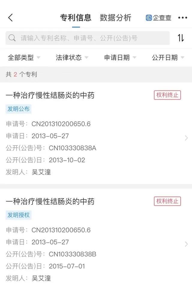 记者查询发现,香雪医药仅有2条专利信息,名称为“一种治疗慢性结肠炎的中药”,专利类型为“发明公布”、“发明授权”,不过,目前这两项专利的法律状态全部为"权利终止"。