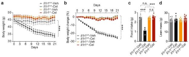 Umut Ozcan及其同事发现Celastrol增强瘦素敏感性和减肥作用需要IL1R1的介导,因为IL1R1的缺失使得Celastrol对肥胖小鼠的减肥和抗糖尿病作用完全消失。该结果于2019年发表于《Nature Medicine》上。