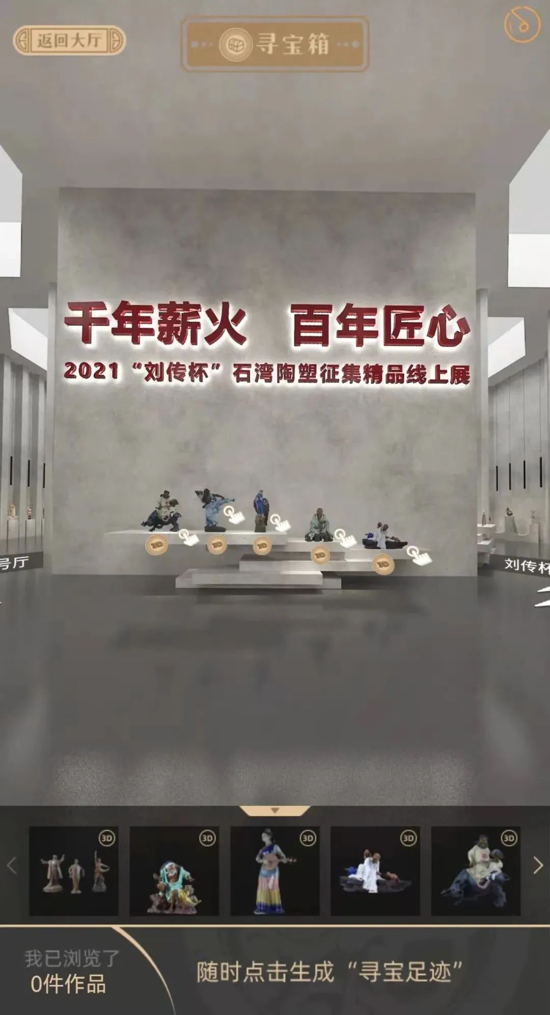 图为:“千年薪火,百年匠心”——2021“刘传杯”石湾陶塑征集精品线上展、“青春如歌”——2021“石湾杯”青年陶瓷大赛作品线上展、“创意赋能,领潮国风”——2021佛山(禅城)文创产品线上展三大虚拟展厅截图。同时,系列线下展览也可以到南风古灶片区各个展览点现场观看~