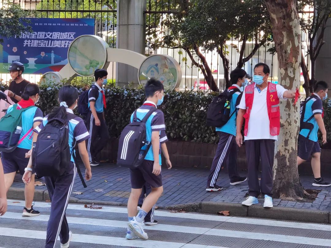 在创建全国文明城区的日子里,上海大学附属宝山外国语学校志愿者教师们冲锋在前,全力保障学校创全工作。每天早晨,蓝色的志愿者马甲是一道靓丽的风景线,忙碌在校园外的非机动车道上,从家长的车上、手中接过上学的孩子,穿过非机动车道,为爱守护孩子安全进校的“最后一百米”。
