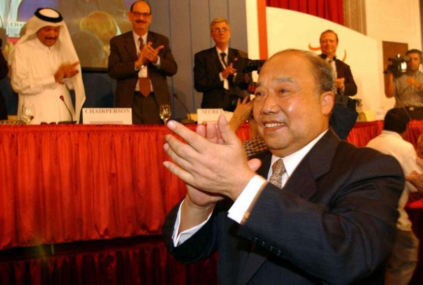 ↑2001年11月10日,在卡塔尔首都多哈,世界贸易组织第四届部长级会议审议并通过中国加入世贸组织的决定后,时任中国政府代表团团长、外经贸部部长石广生与其他与会者鼓掌庆贺。新华社记者 王建华 摄从“复关”到“入世”