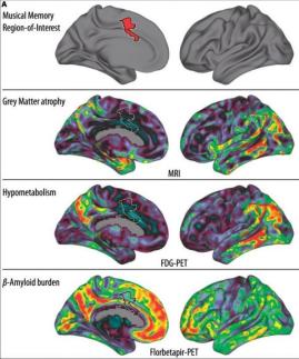 认知障碍患者的大脑会按照一定顺序出现明显的萎缩,而音乐记忆的脑区萎缩的最晚,所以即使是认知障碍的患者,依然能对曾经听过的音乐有印象。