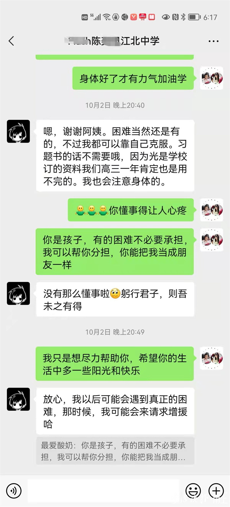 陈奕今年刚上高三,平日里王兰玲经常关心他的学业。“需要高三课程的资料吗?需要的话我买好寄给你!”“学习的同时别忘了照顾好自己,身体好了才有力气学习!”