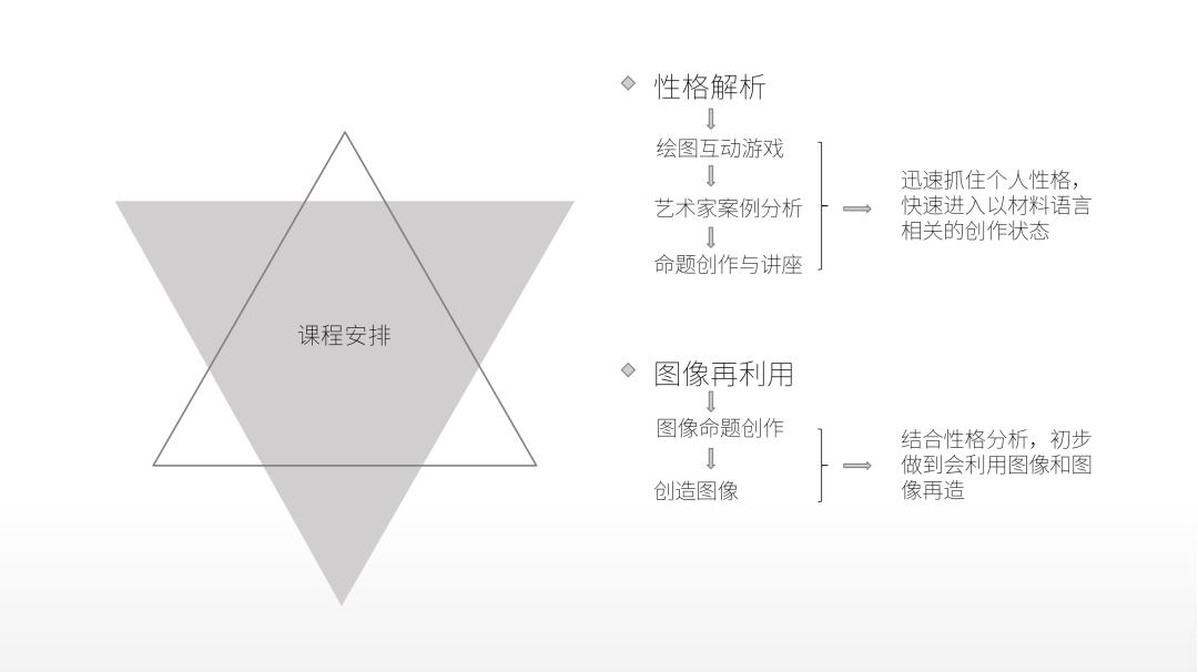 “性格解析与图像再利用”这门课便是我凭借之前的经验总结,在工作室主任吴啸海设定的课程大纲范围内开设的创作性素描课程。此课程力图使学生迅速地由写生思维转换到创作思维上来,使素描教学有新的面貌和探索。课程分为两部分,一为性格解析部分,即在课堂互动游戏和学生分别演讲的形式中,使学生能在图形总结的模式下迅速找到各自的性格特征,并以此为基础在纸上创作出具有鲜明性格特征的作品,其主要内容为图形互动游戏、艺术家案例分析与讲座、命题创作。二为图像再利用部分,即在性格解析的基础上,利用现有图像进行再利用创作或图像的再造。由教师提供多组现成图像,学生从中发现可提取的因素,并结合性格进行艺术提炼的创造。该课程通过短时间图像认知和表达能力的训练,使学生快速掌握寻找可用素材的能力,培养学生的艺术表达力和观察力。