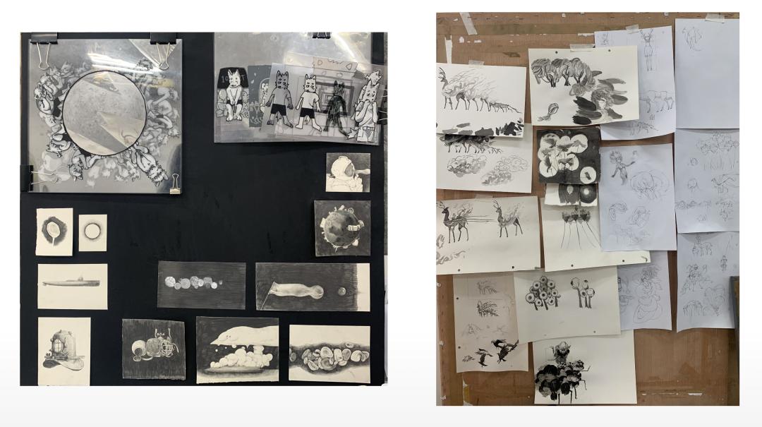 从进入壁画系任教开始,我经历了第二工作室和第五工作室两个体系的教学体验。第二工作室的三位老师——孙韬、曹巍、王长兴,在课程梳理和师德学风建设上都给予了我最大的支持和帮助。他们不仅是我学生时代的老师,更在我任教后帮助我迅速地转换学与教的身份。在三年的教学生活中,我真正体会到了教学的不易,也总结出了一些自己的经验。在第二工作室,我主要辅助三位老师进行素描创作方面的教学,这使我在进入第五工作室之后能够有足够的经验来独自支撑教学任务。