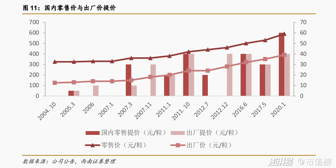 经常与东阿阿胶相提并论的片仔癀,也是提价常客。根据西南证券统计的数据,从2004年至2020年,片仔癀锭剂产品一共提价19次。片仔癀锭剂的出厂价从2004年的125元/粒升至2020年1月初的390元/粒,提价幅度为212%,零售价从325元/粒上涨至590元/粒,提价幅度为81.54%。