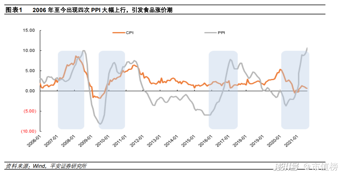从2006年起,国内一共出现了4次PPI的大幅上涨,也带动了食品饮料行业4次涨价潮。