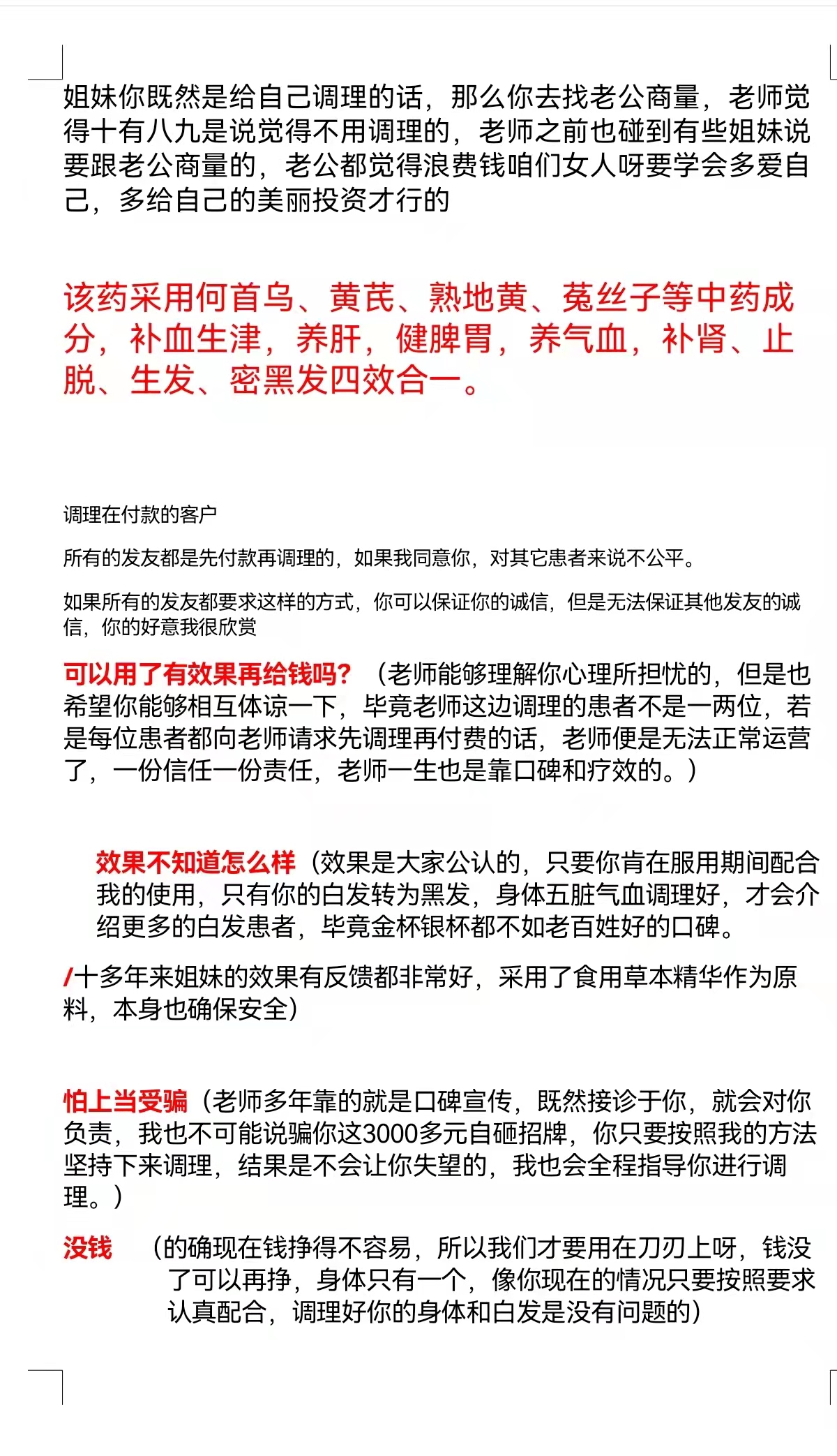 虽然提供的地址位于广东无法验证,但张女士禁不住对方所谓“秘方”神奇疗效的诱惑,抱着试试看的心情花了1580元网购了一个疗程,并收到了对方寄来的育发中药膏、流传金方茶、理疗足贴等产品。而在使用这些产品一段时间后,张女士发现自己的白发并没有发生转黑。当其向“王老师”提出质疑时,对方又以其“体质不好”,需要量身打造“发质转黑”的调理计划为由,陆续向张女士推销了所谓的“洗头茶”“本草乌密”等产品,并分两次又收取了12000多元的费用。而当张女士使用这些产品后,非但头发没有转黑,还出现了头皮红肿、脸部浮肿等症状。意识到自己可能被骗后,张女士向杨浦警方报了案。