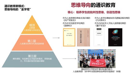 构建“思维导向的通识教育-前沿导向的专业教育-研究导向的教师教育-英才导向的智能教育”育人体系,为文科人才培养建立新的课程规范和实践教学体系。学校构建了以思维训练为特色的通识教育课程体系,整个体系犹如金字塔型,其中“人类思维与学科史论”课程群位于塔尖,旨在让学生跨越学科界限,引导学科交叉融合,从不同学科的历史发展中汲取“思维自由”的养分,已累计开设20门次,修读学生近600人。