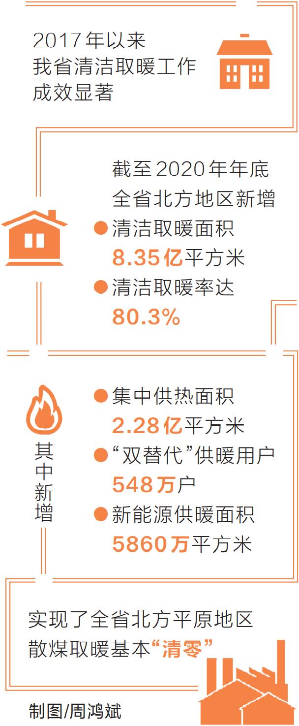 省发展改革委相关负责人介绍,2017年以来,我省清洁取暖工作成效显著,截至2020年年底,全省北方地区新增清洁取暖面积8.35亿平方米,清洁取暖率达80.3%,其中,新增集中供热面积2.28亿平方米,新增“双替代”供暖用户548万户、新能源供暖面积5860万平方米,实现了全省北方平原地区散煤取暖基本“清零”。