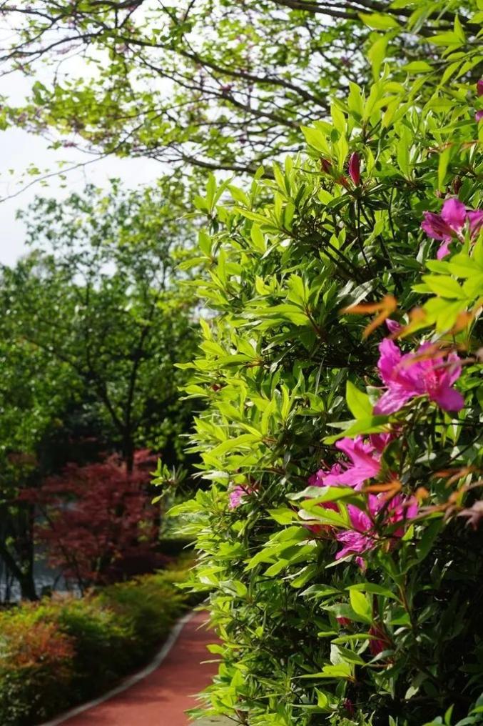 沿湖的健身步道周边绿树成荫、百鸟争鸣