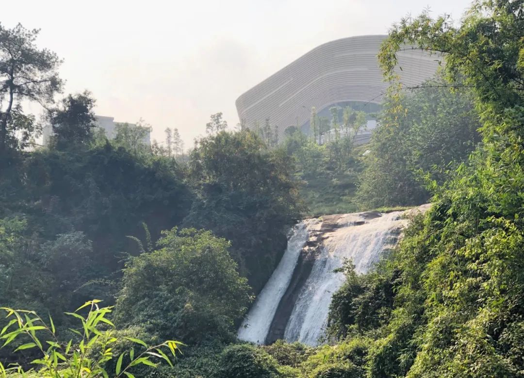 园区内还有一个高约10米的瀑布在阳光的照射下
