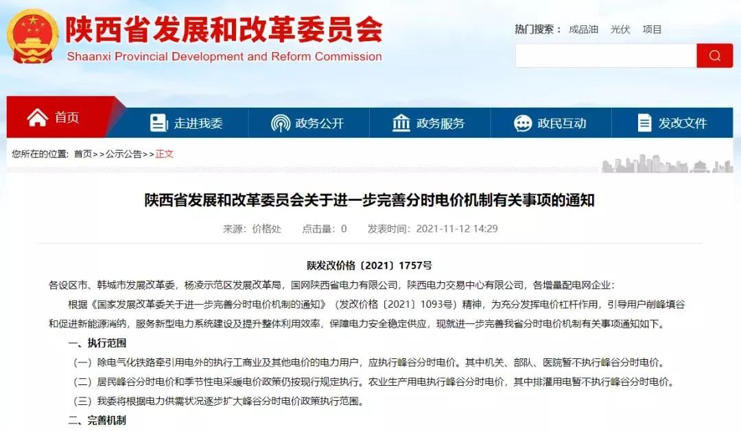陕西最新通知!事关电价!日前,陕西省发展和改革委员会在官网发布关于进一步完善分时电价机制有关事项的通知。通知明确,居民峰谷分时电价和季节性电采暖电价政策仍按现行规定执行。通知规定,每年夏季7月、8月,冬季1月、12月对工商业及其他用电实施尖峰电价,夏季尖峰时段为每日19:30-21:30,冬季尖峰时段为每日18:30-20:30,尖峰时段用电价格在峰段电价基础上每千瓦时上浮20%。详情:陕西最新通知!事关电价!明年1月1日起执行